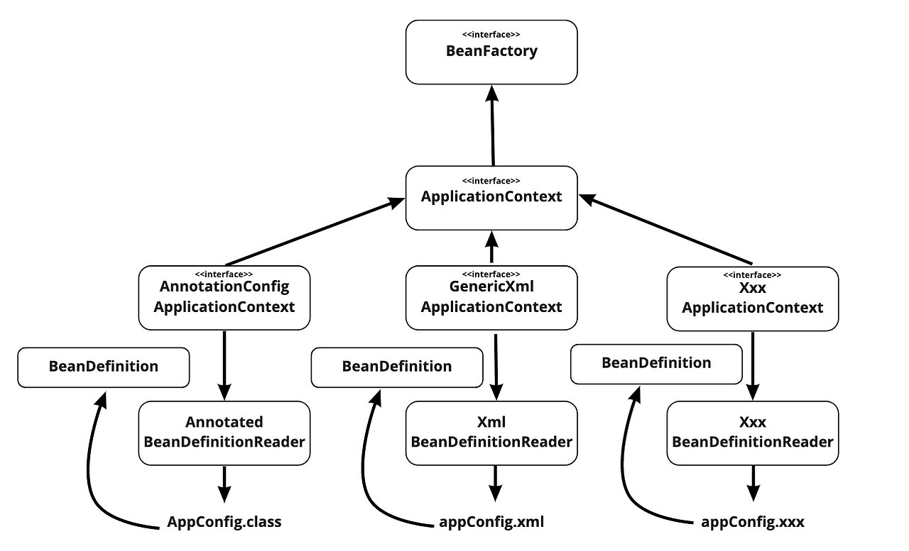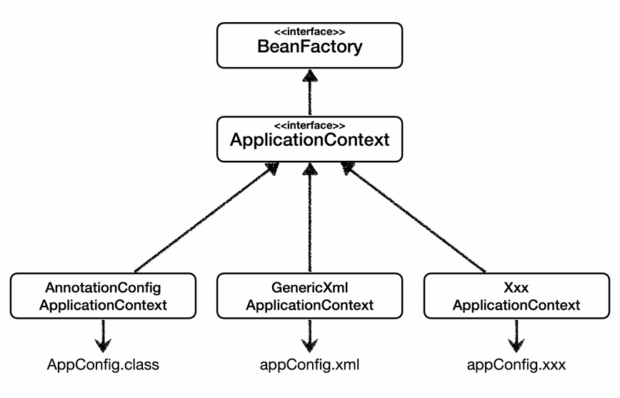 어떤 구현 클래스를 사용하든, 각 구현 클래스는 설정 정보로부터 빈이라고 불리는 객체를 생성하고 그 객체를 내부에 보관한다. 그리고